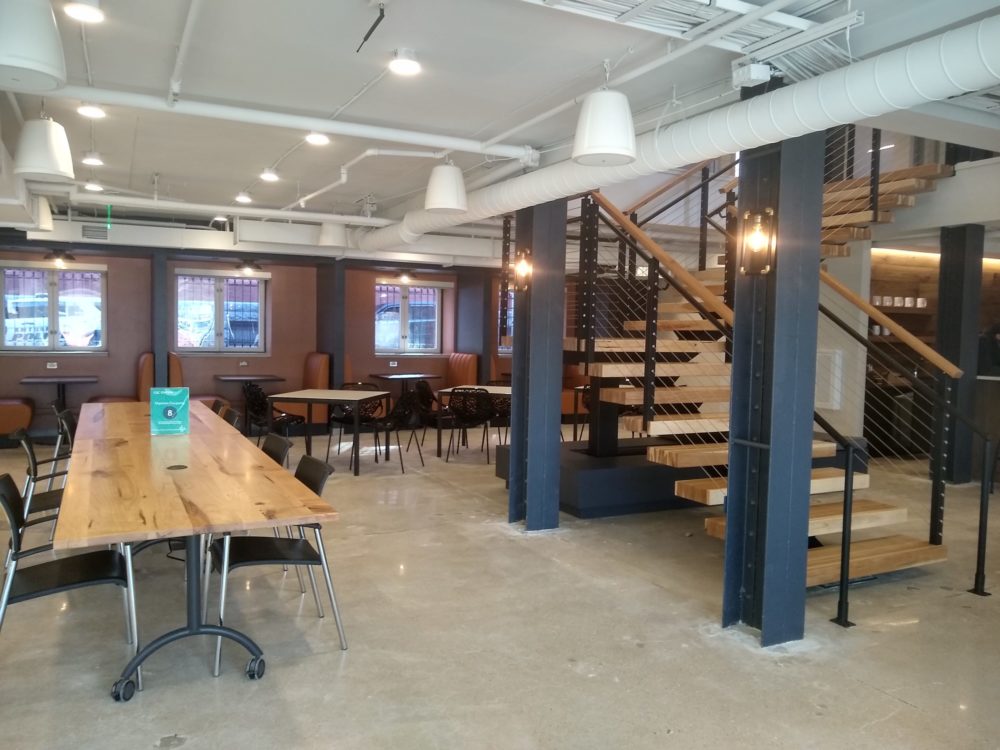 The design, by Philadelphia firm NORR, is industrial, fitting with the building’s roots, with exposed beams, pipes and ductwork. It includes details like a large conference room table made by youth in the Challenge Program, a local organization that offers vocational skills training to at-risk teenagers in Wilmington that is often contracted to create pieces for downtown workspaces.