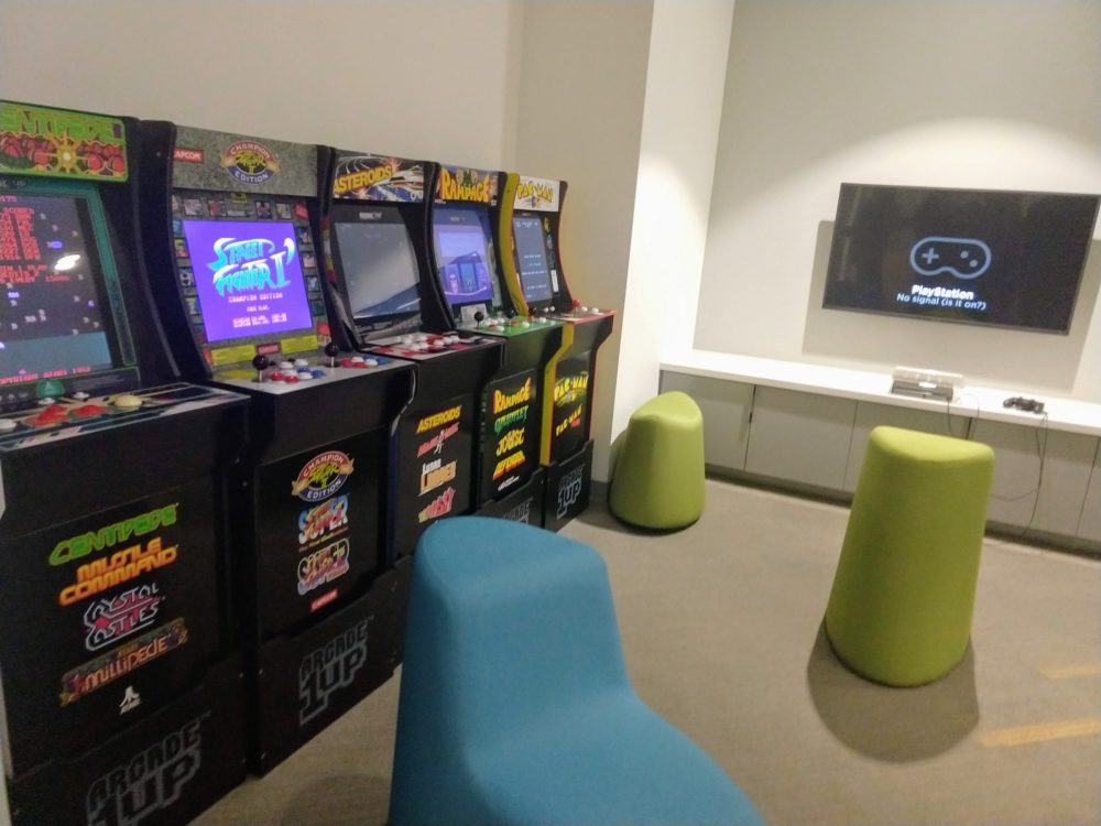In the game room, a row of classic arcade video games line a wall near screens hooked up to Playstations. There is foosball, air hockey, pool and a golf-putting green.
