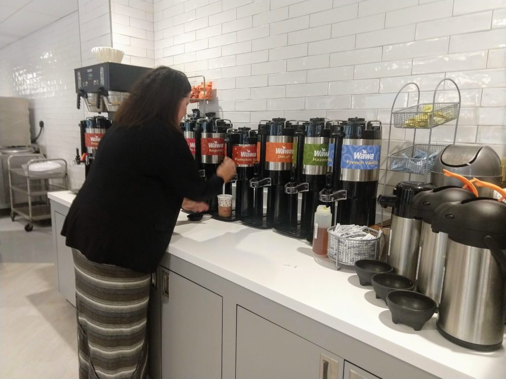Announced in 2018, the new center has been fully renovated into a modern, employee-focused workplace, with ergonomic, height-adjustable workstations; multi-function collaboration and meeting spaces that accommodate anywhere from two to 200 people; and a state-of-the-art workout facility. A Starbucks greets employees and guests on the third floor, where a full cafeteria also serves Wawa coffee and meals made on site, including a salad bar.