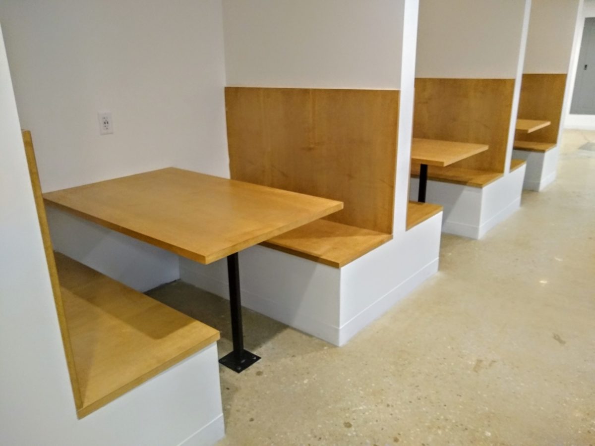 The bar area with charging stations faces a coffee and beer station, which can be used as communal work space, a happy hour spot, or a place to have lunch; part of the bar lowers for wheelchair accessibility. On the other side of the bar area is a wall of wooden booths, which Larason points out are a free alternative to renting a conference room for small groups, and a wall of glass-encased conference rooms.