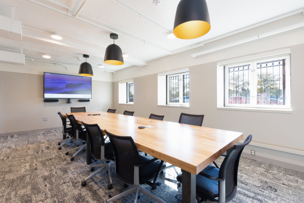 The design, by Philadelphia firm NORR, is industrial, fitting with the building’s roots, with exposed beams, pipes and ductwork. It includes details like a large conference room table made by youth in the Challenge Program, a local organization that offers vocational skills training to at-risk teenagers in Wilmington that is often contracted to create pieces for downtown workspaces.