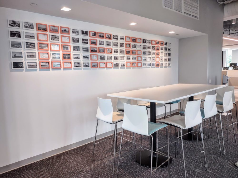 Cubicles have safety partitions, but at this point, social distancing is easy with fewer on-site employees. Even face-to-face meetings are adaptable to just about any arrangement, with options from casual whiteboard setups to roomy one-on-one spaces to formal boardrooms. There’s even an outdoor meeting space with a TV monitor. Having so many different types of meeting places throughout the building was intentional, Urban said, and is part of the ongoing feedback collection from colleagues, to see which types they’d like more (or fewer) of.
