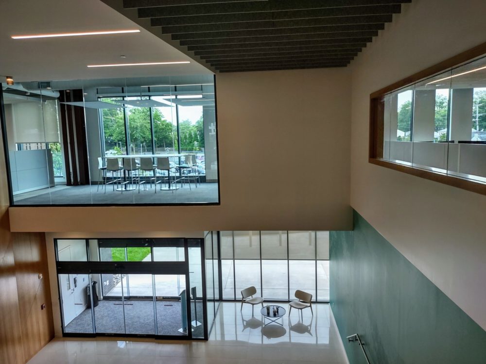 The building sits beside Concord Plaza’s mixed-use development of apartments, restaurants and retail spaces, and faces a tree-lined parking lot that is within view of another BPG project, The Mill Concord. It looks like a fairly standard modern office building on the outside. What sets it apart is that is was designed over the course of its construction to be somewhat pandemic proof, from the high-tech body temperature check in the lobby to the layout of its workspaces.